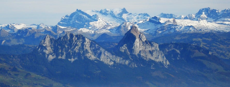 Im Vordergrund ragen die Mythen-Spitzen ins Bild, die das Alpthal vom Talkessel Schwyz (rechts) trennen. Zankereien um Land- und Wasserrechte in den Täler hinter